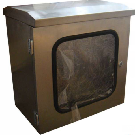 2、箱體分上箱體、下箱體(為斜(xié)麵式吻合,吻合麵上下端部箱體為弧型)。上(shàng)下箱體用不鏽鋼合(hé)葉連接(jiē),由橡塑(sù)條密封,下端安裝不鏽鋼吊扣以壓緊(jǐn)。前開門帶觀察窗,有傾斜式防雨頂(dǐng)蓋,門與箱體之間采(cǎi)用防濺結構,能防雨防塵,適與(yǔ)室內外安裝;