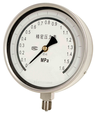 精密壓力表(biǎo)由測壓係統(tǒng)、傳動機構、指示(shì)裝置和外殼組(zǔ)成。精密壓力表的測壓(yā)彈性元件經特(tè)殊工(gōng)藝處理,使精密壓力表性(xìng)能穩定可靠,與高精度的傳動機構配套調試後(hòu),能確保精確(què)的指(zhǐ)示精度。
