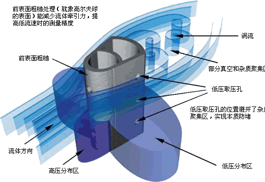 威力巴的獨特設計,使低壓取壓孔位於探頭側後兩邊,流體(tǐ)分離點和(hé)尾跡區的前部。這種設計從本(běn)質上防止了堵塞並且能產生一個非常穩(wěn)定的低壓(yā)信號(hào)。